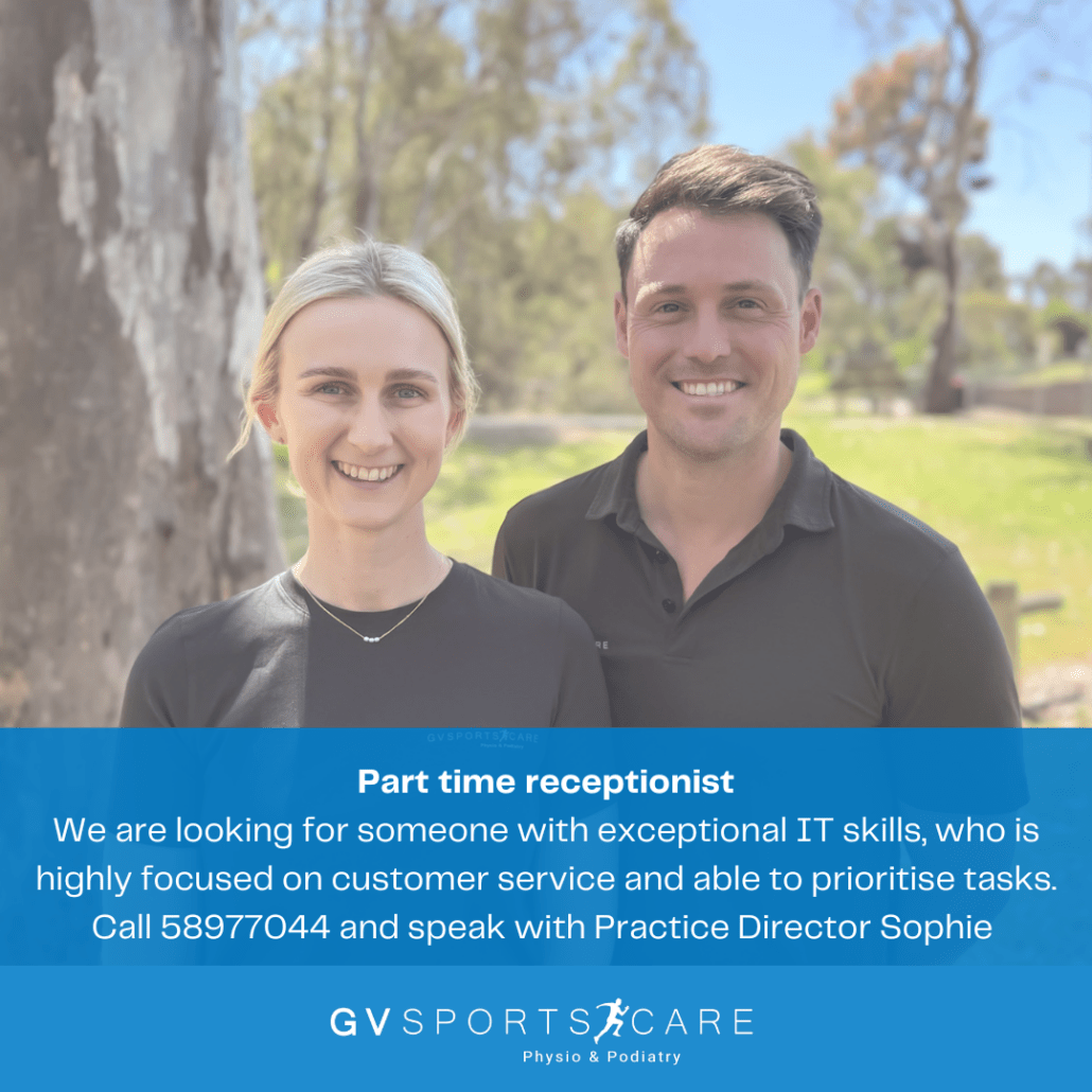 GV Sportscare are looking for a part time receptionist to join our passionate healthcare team in Shepparton: Seek Ad click here